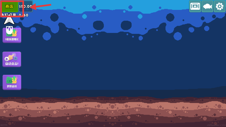 1、游戏开始,点击左上角图标,进入商店准备用金币购买鱼苗。