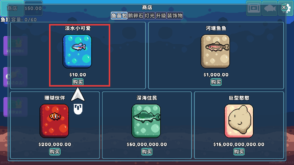 2、在商店中,选择【淡水小可爱】鱼苗(售价$10.00),点击“购买”获取鱼苗。