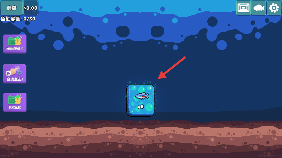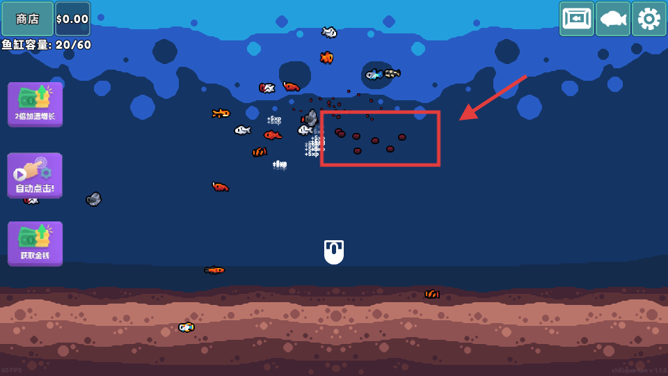 4、不断点击屏幕,投放饲料让鱼苗健康成长。