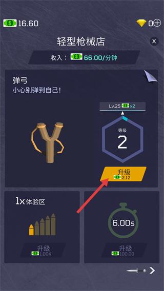 2、在【轻型枪械店】界面,消耗【212】资源点击【升级】按钮,将【弹弓】升至【Lv.25】,提升收益效率。