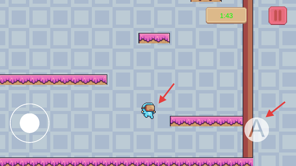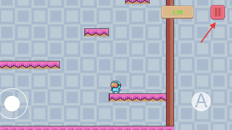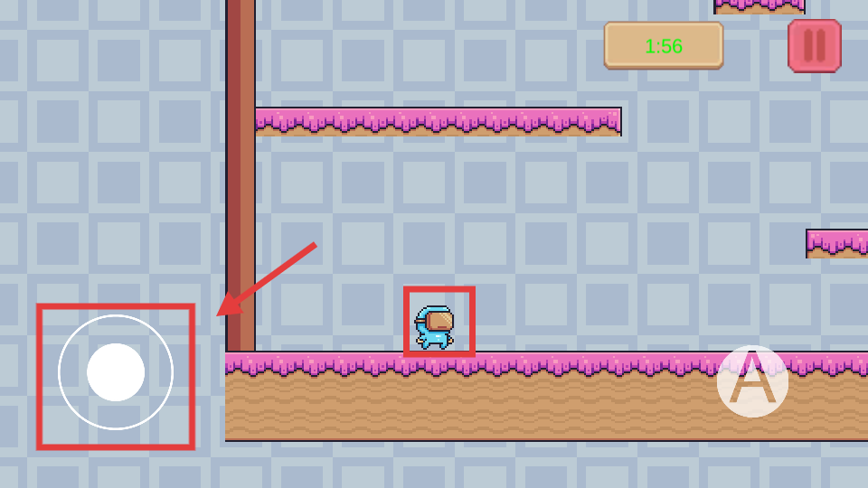 2、遇平台间隙,点右侧【A】按钮,让蓝色小人跳跃到下一个平台。