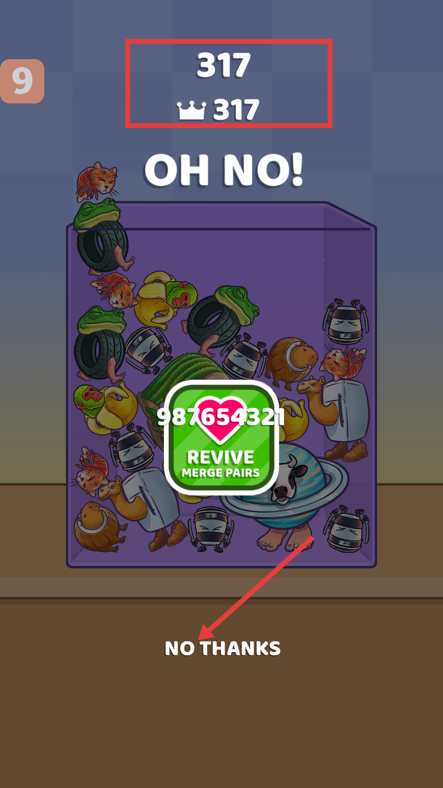 4、游戏结束后,可选择【REVIVEMERGEPAIRS】复活继续或点击【NOTHANKS】结束。