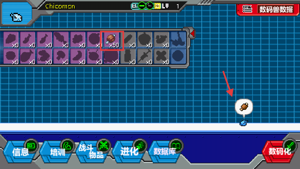 3、在物品栏中,使用拥有的食物,递给数码兽。
