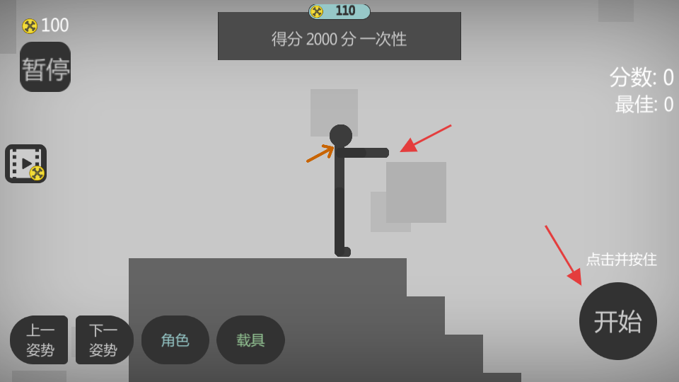 2、选择好姿势后,点击并按住【开始】按钮,使火柴人从平台坠落。