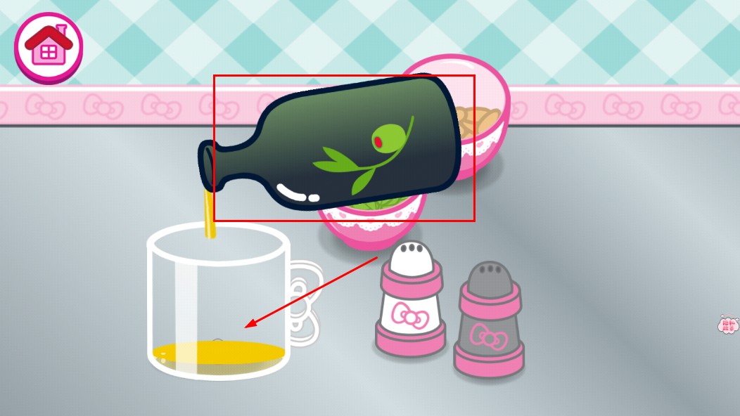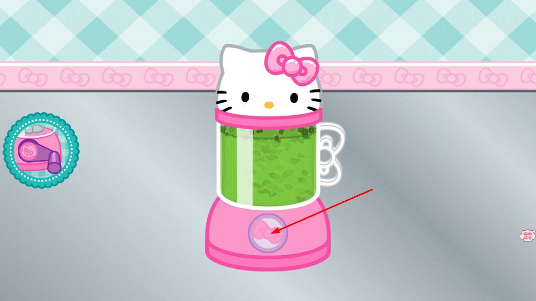 3、如需制作绿色的糊状酱料,将相关材料放入HelloKitty造型的搅拌机,点击按钮启动搅拌。