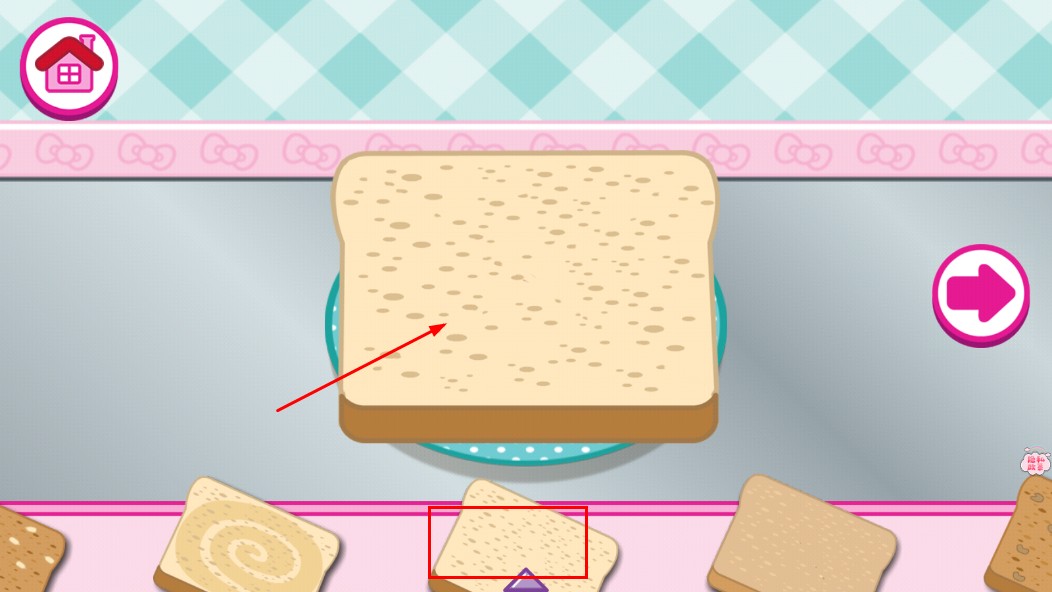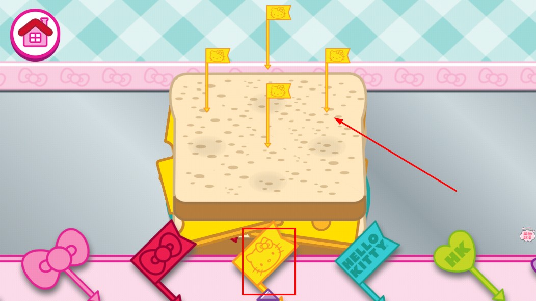 4、最后,用带有HelloKitty元素的装饰小旗等物品,对制作好的食物(如三明治)进行装饰,完成菜品制作。