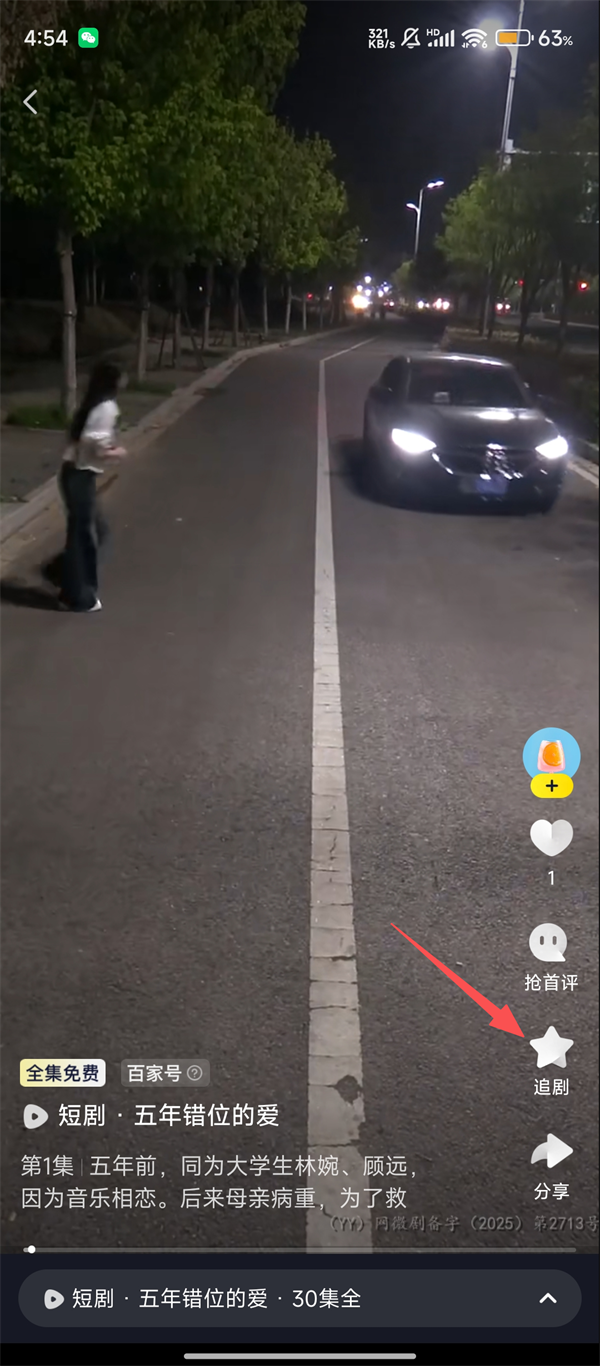 4、进入短剧播放页面后,点击右侧【追剧】按钮,就能将这部短剧加入追剧列表,方便后续继续观看啦。