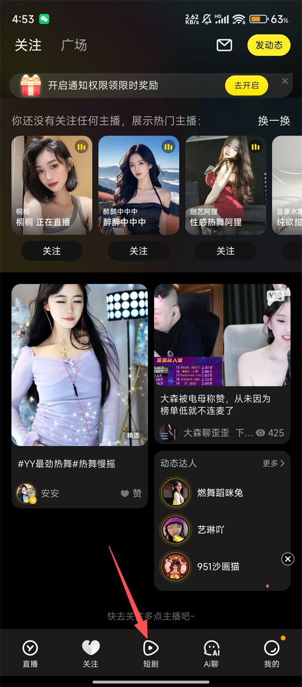 1、打开YY直播App,点击底部【短剧】按钮,即可进入短剧专区,开启短剧观看之旅啦。