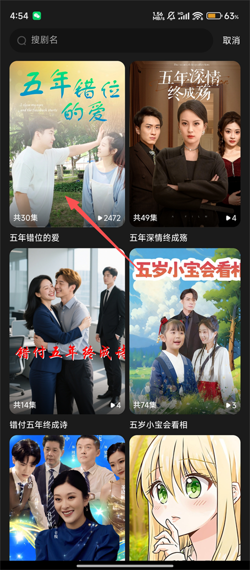 3、在搜索结果中,找到【五年错位的爱】短剧封面,点击它就可进入该剧播放页面哦。