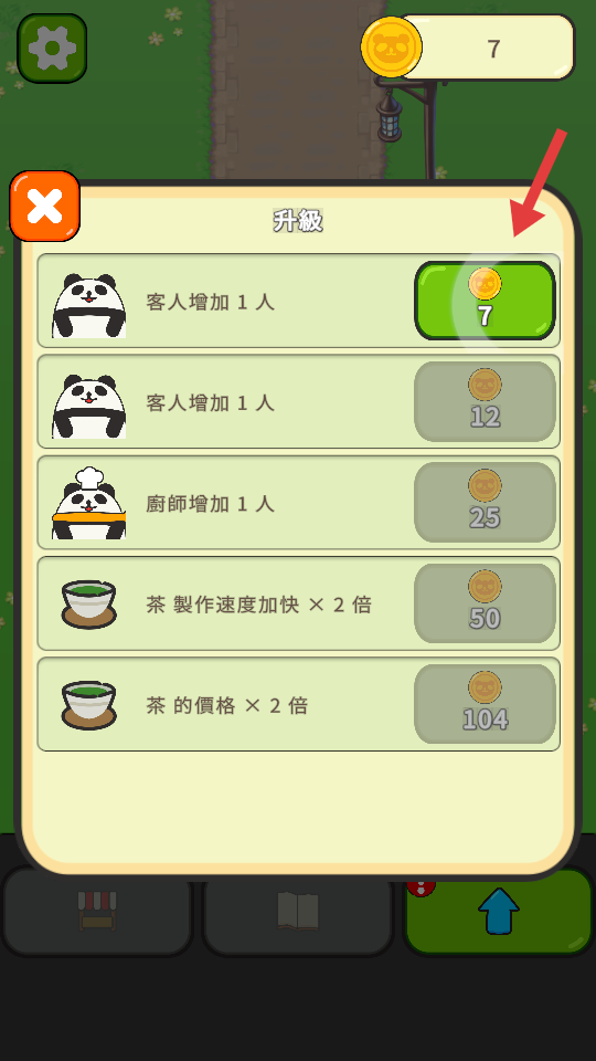 4、在界面里,花费7枚金币选择“客人增加1人”的项,提升店铺接待客人的数量上限。