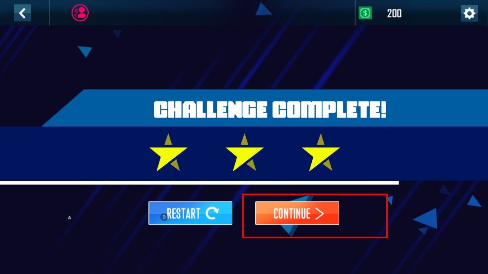 4、成功完成挑战后,点击“CONTINUE”,继续后续的赛车挑战任务。