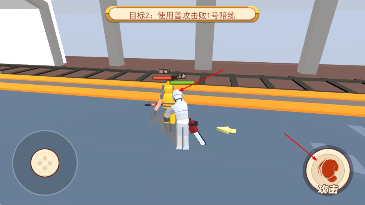 3、靠近后,点击右侧【攻击】按钮,使用普攻,击败“1号陪练”。