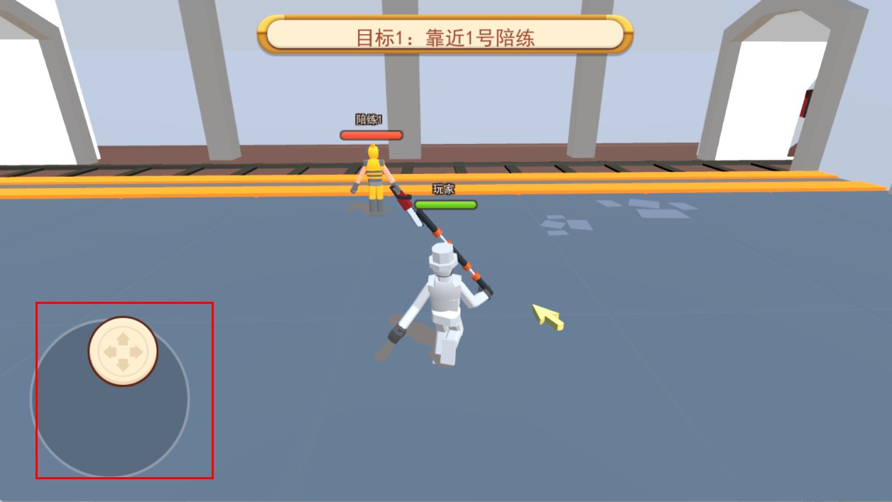 2、用左侧虚拟摇杆,操控角色移动,靠近目标“1号陪练”。