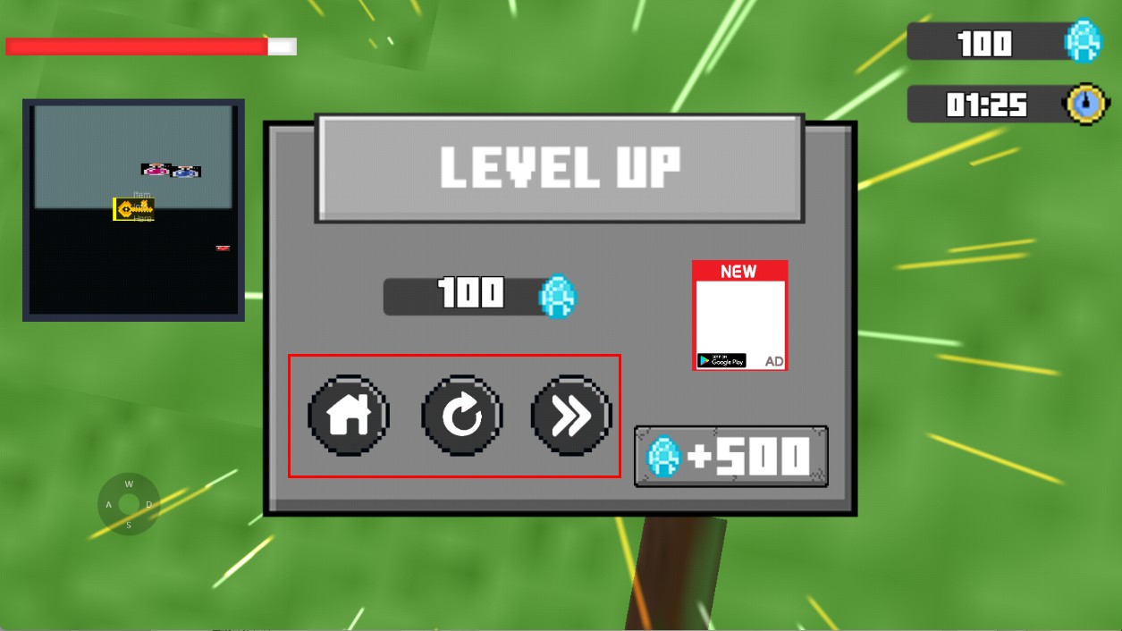 4、升级后,可选择返回主页、重玩或进入下一关,继续挑战,提升角色等级。