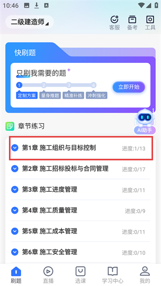 2、在【刷题】的章节练习中,勾选需重置的章节(如【第1章-施工组织与目标控制】)进入对应练习页。