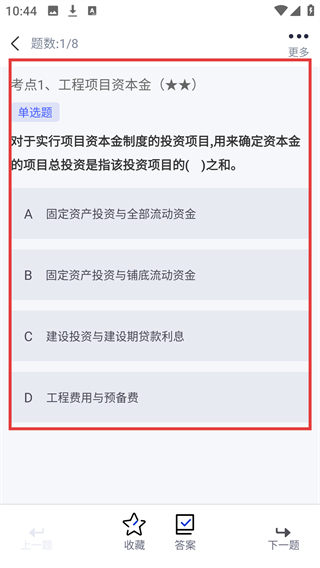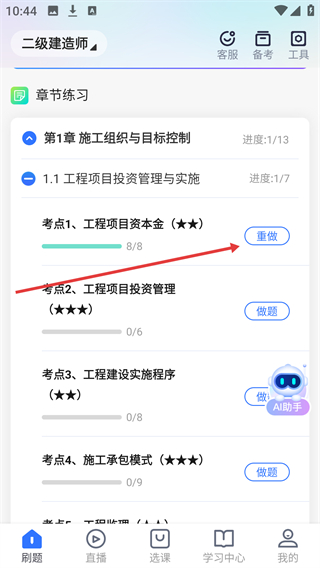 3、进入章节练习的考点列表,找到已完成的考点(如【考点1-工程项目资本金】),点击右侧【重做】按钮。