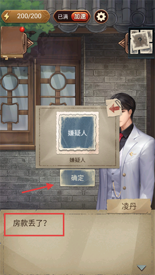 2、遇到【嫌疑人】线索,点击【确定】,结合【房款丢了?】,推进调查。