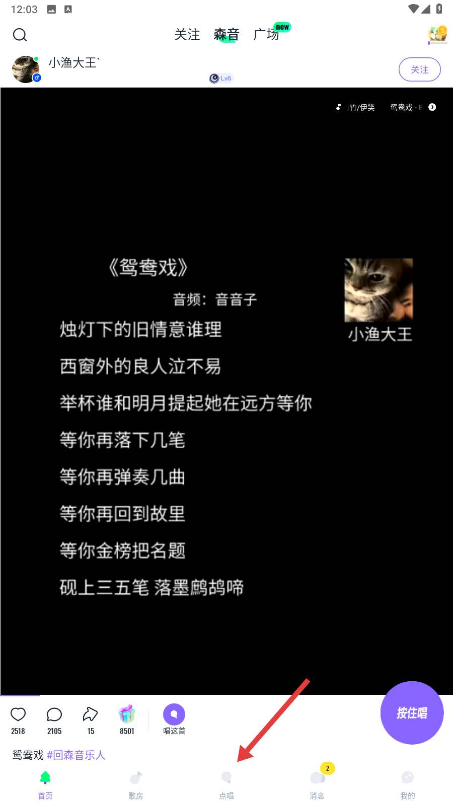 1、我们打开回森,点击底部的【点唱】,进入点唱相关页面哦。