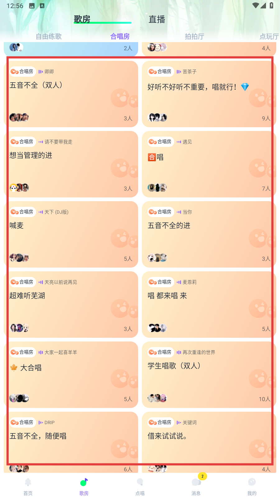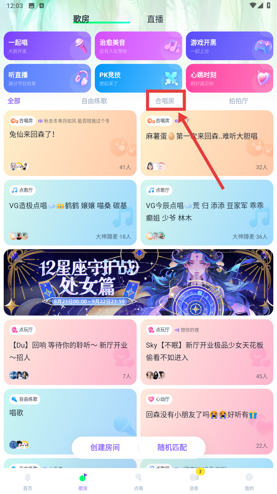 2、在歌房页面,点击【合唱房】标签,方便挑选合适的合唱房呀。