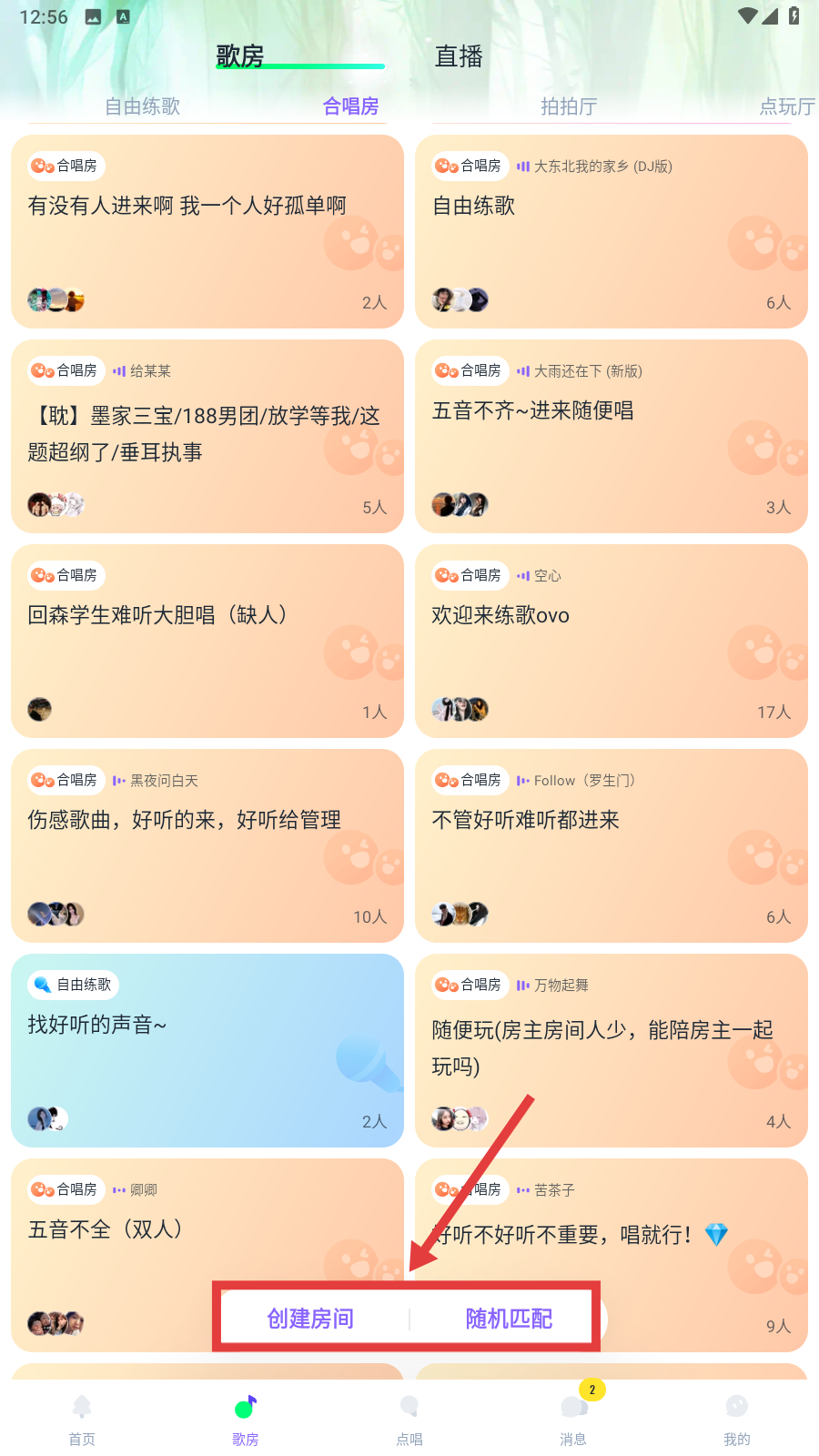 4、若想自己组织合唱,可点击【创建房间】,若想随机匹配合唱伙伴,就点击【随机匹配】,轻松开启合唱呢。