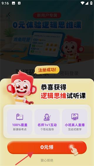 4、注册成功后,可点击【0元领】获取逻辑思维试听课,享受100%覆盖新课标等课程服务。