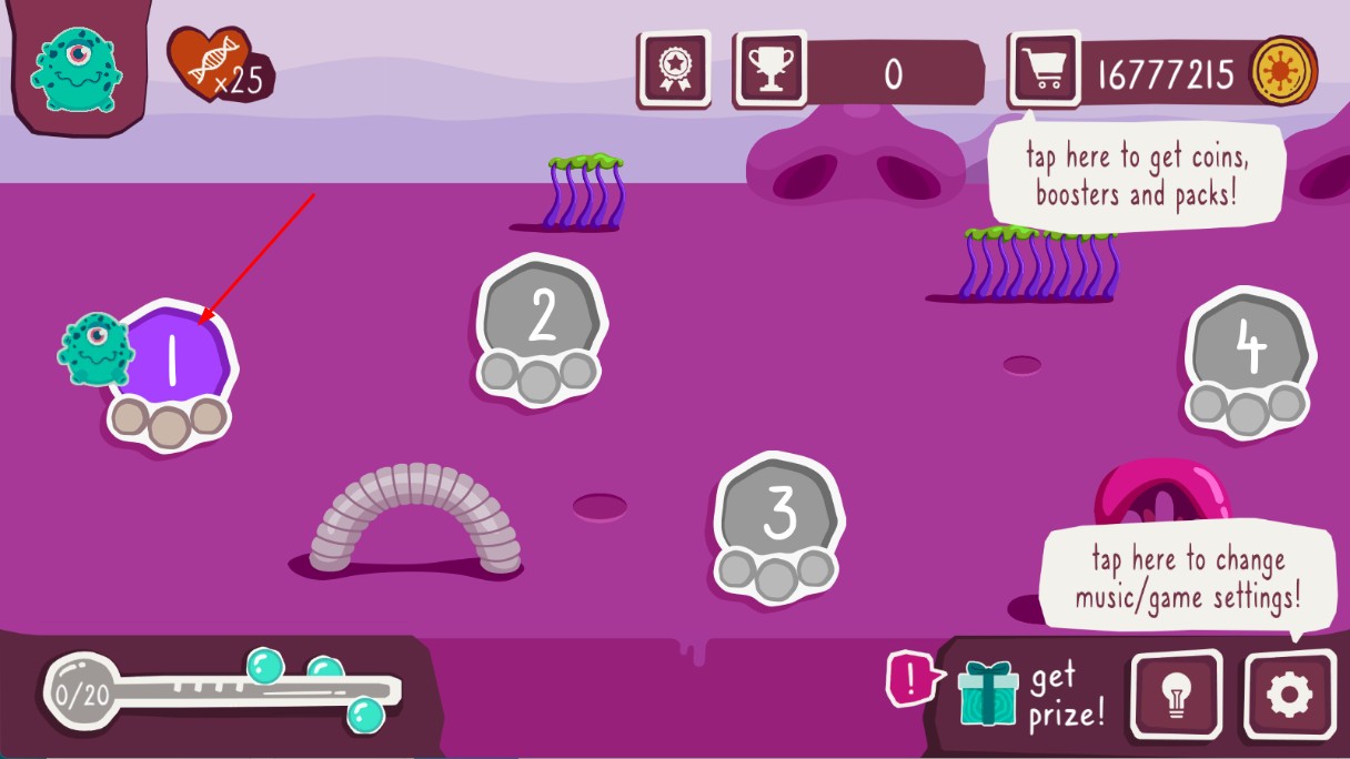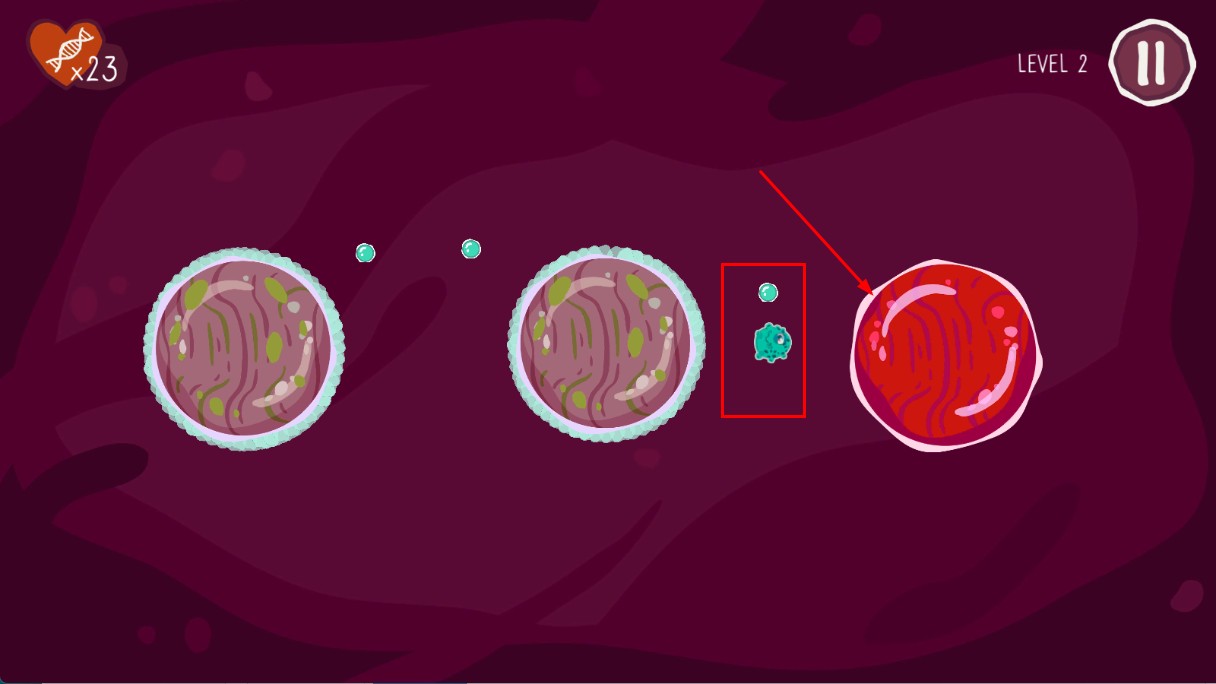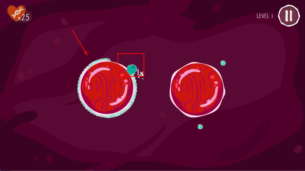 2、操控绿色小怪物,靠近红色细胞,进行感染操作,推进关卡进程。