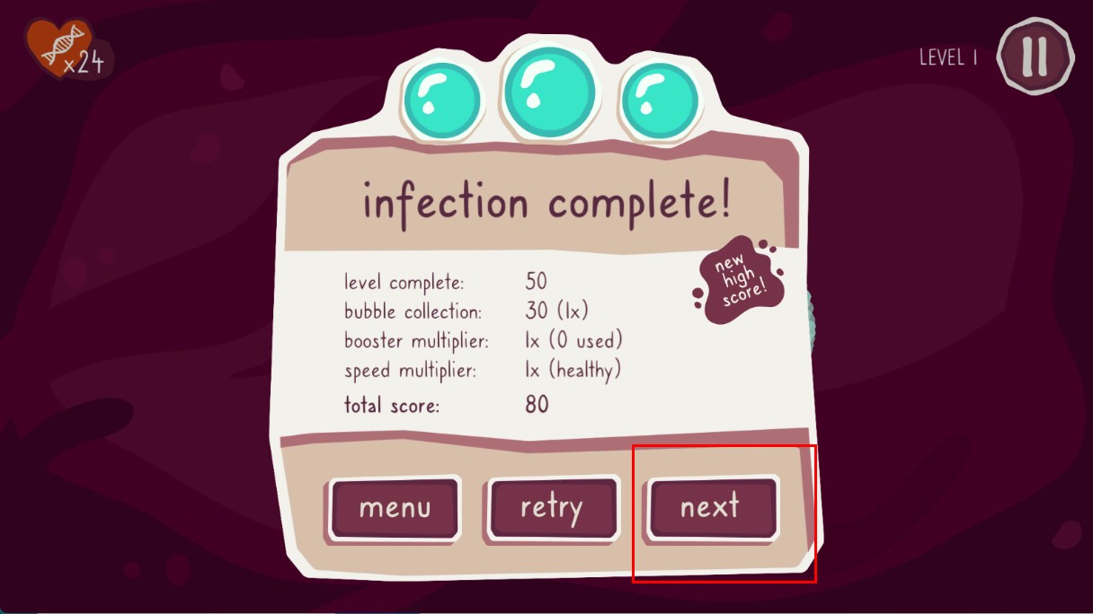 3、感染完成后,查看关卡结算界面,点击【next】,进入下一关继续挑战。