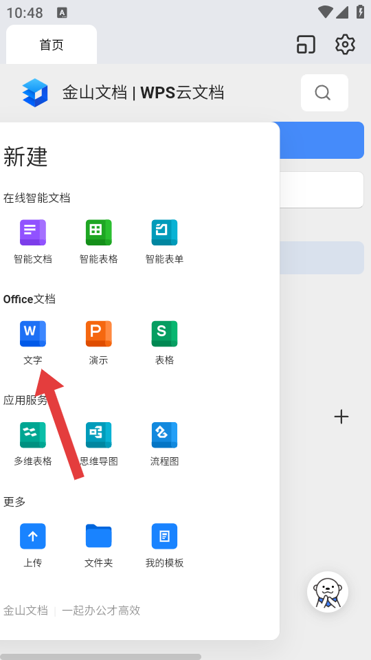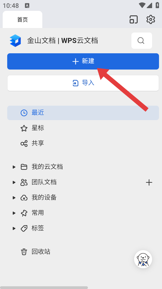1、打开金山文档APP进入【首页】,点击【新建】按钮,创建新文档。