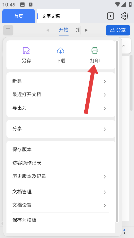 4、在弹出的菜单中,点击【打印】选项,按照提示连接打印机并完成文档打印操作。