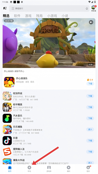 1、打开应用宝,点击底部的【秒玩】按钮,就能进入秒玩页面,开启找游戏的旅程啦。