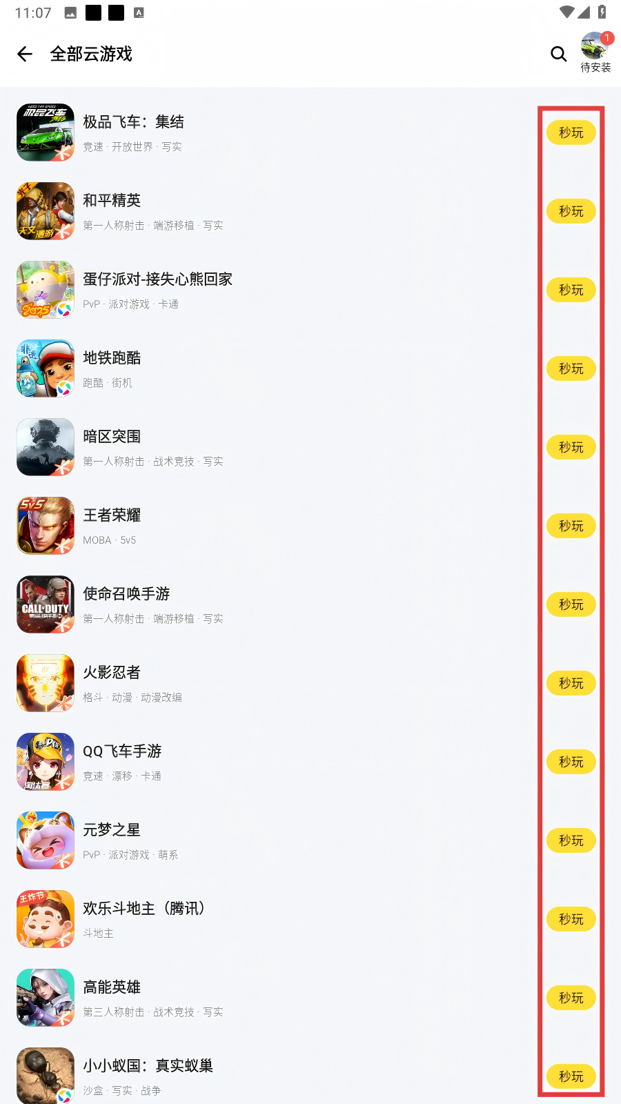 4、找到想玩的游戏后,点击它旁边的【秒玩】按钮,这样就不用排队,能直接畅玩游戏啦。