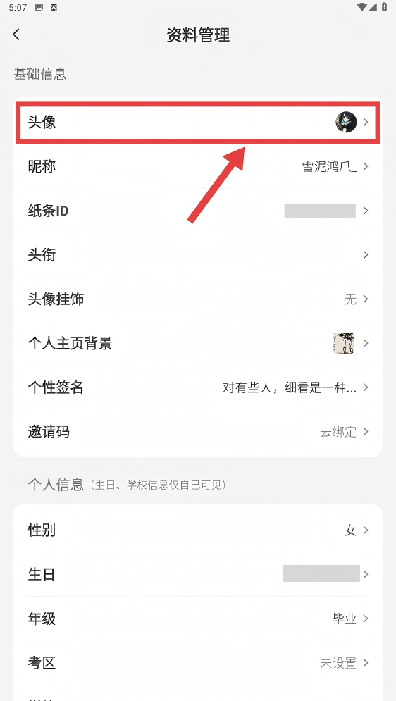 3、到了【资料管理】页面,找到【头像】选项,轻轻点击,就可以准备更换头像啦。