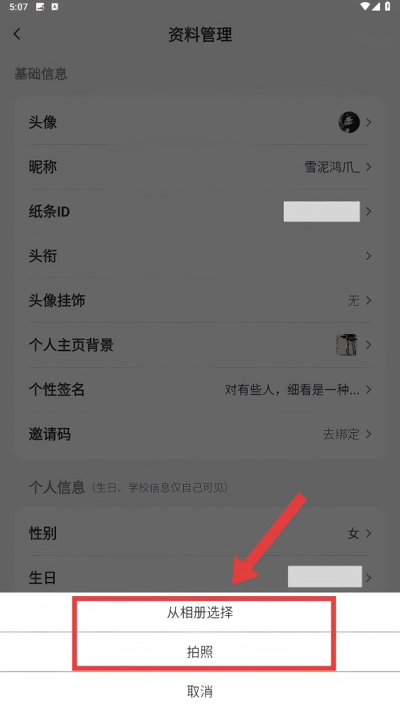 4、点击【头像】后,会弹出选项,选【从相册选择】或者【拍照】,就能选取新头像咯。