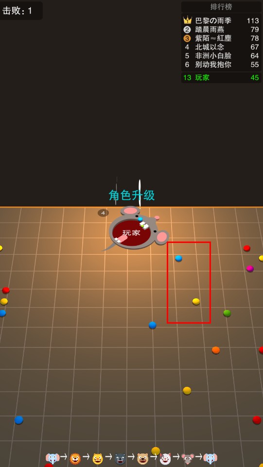 3、操控角色移动,吃掉场景中的彩色小球,使角色升级,同时击败其他对手,提升排名。