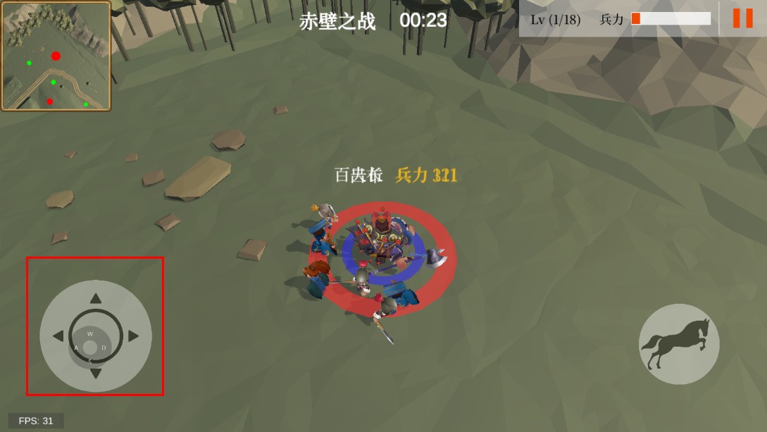 3、通过左侧虚拟摇杆操控角色移动,在战场与其他角色互动,参与战斗,提升兵力等属性。