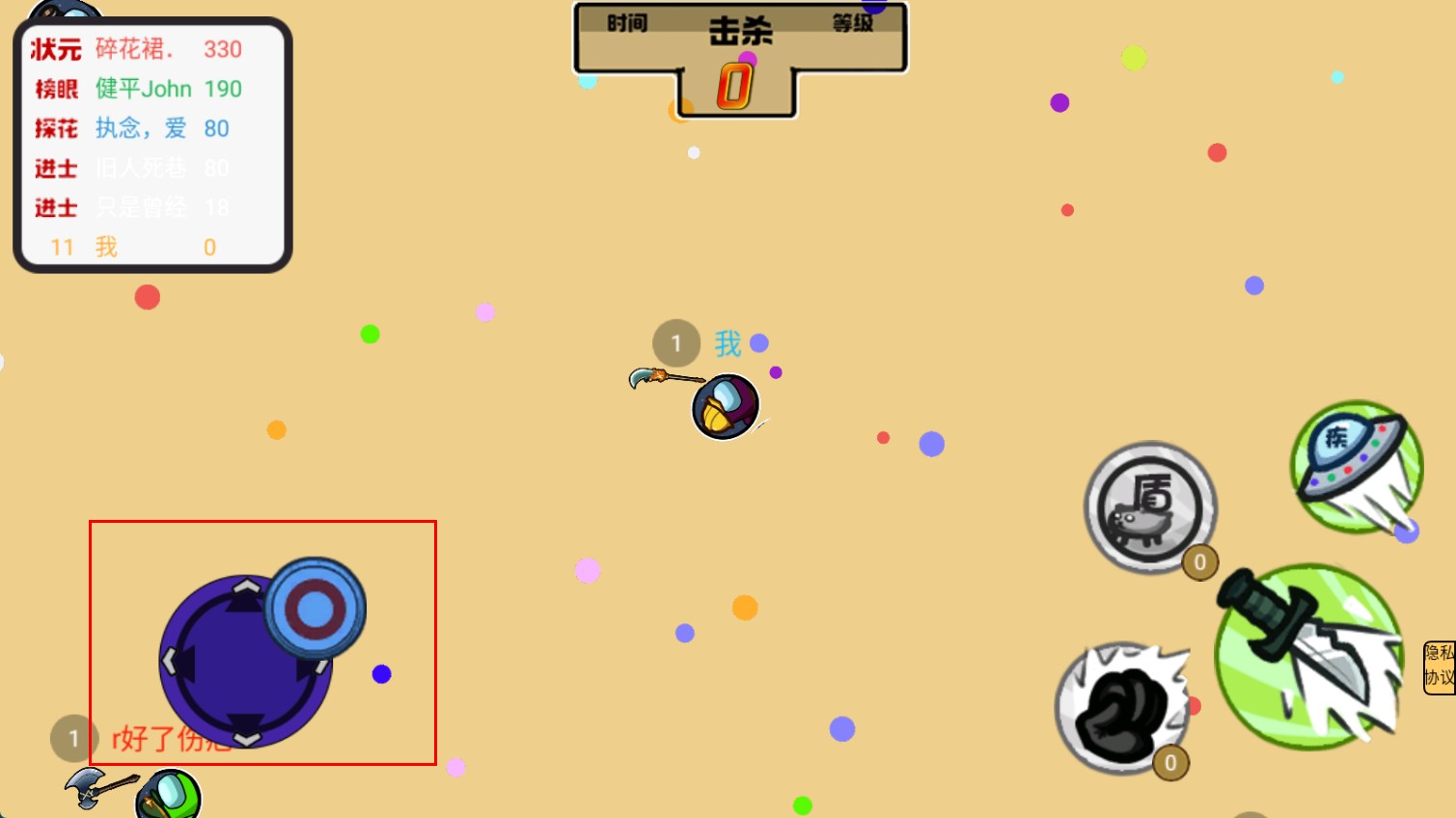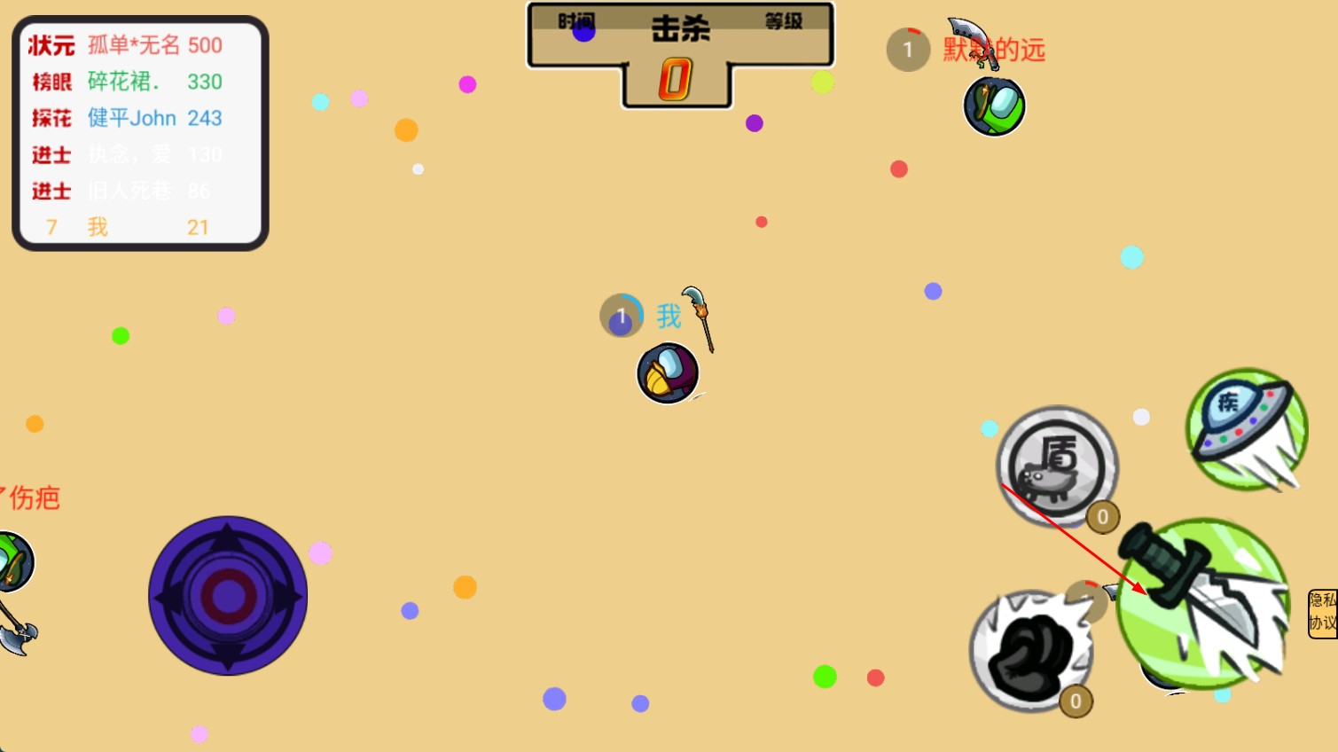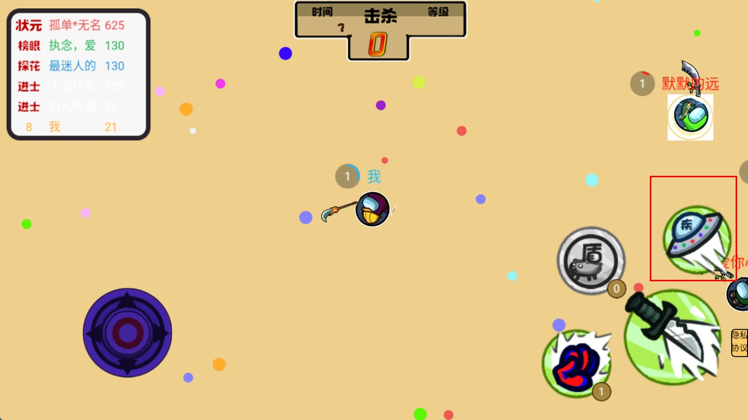 2、利用虚拟摇杆,控制角色移动,靠近彩色光点,收集资源提升等级。