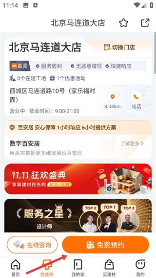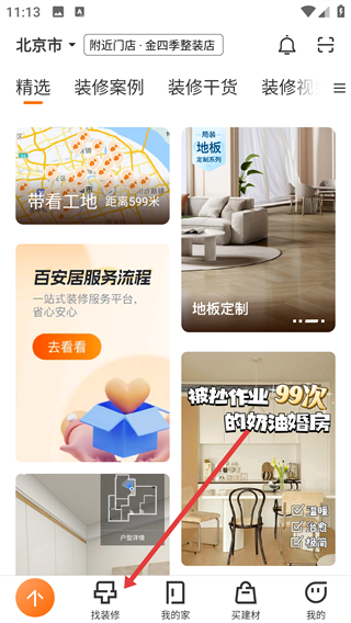 1、打开百安居App,点击底部【找装修】,进入装修服务页面哦。