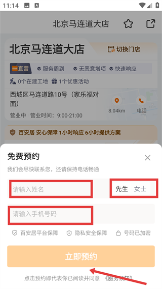 4、在免费预约界面,填写【姓名】、【手机号码】并选择称谓,最后点击【立即预约】完成门店预约啦。