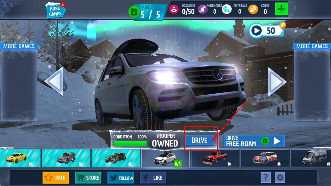 1、点击【DRIVE】,选择车辆,进入雪地驾驶关卡,开启任务挑战。