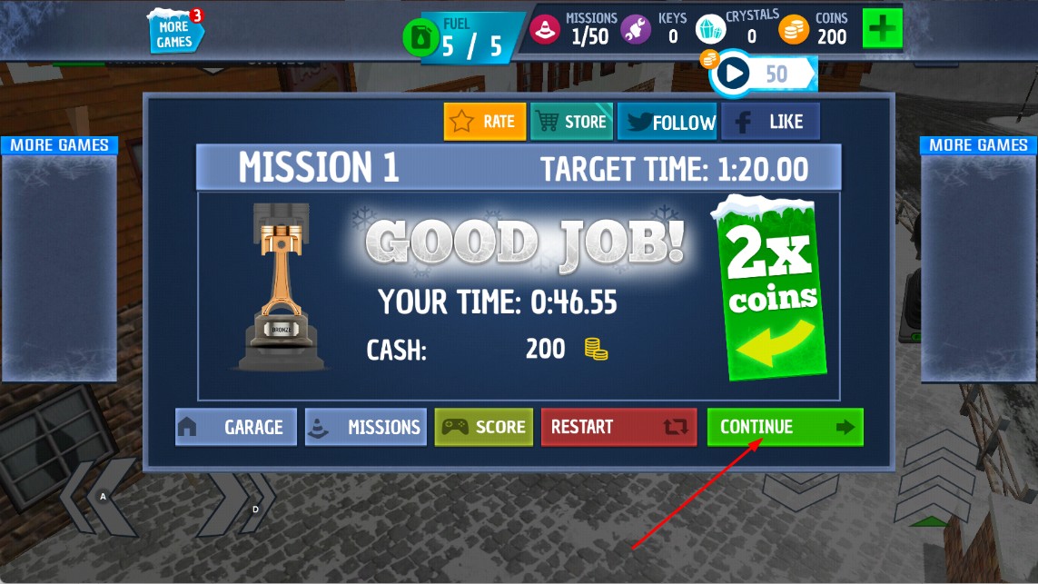 4、完成任务后,点击【CONTINUE】,可继续下一关,积累金币与奖励。