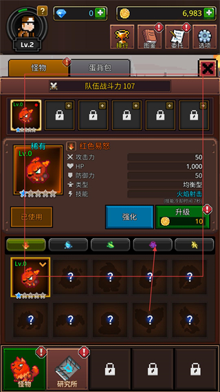 2、玩家可以查看怪物属性技能,耗金币强化升级,提升攻、血属性,增强队伍整体战斗力。