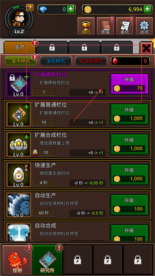 3、还可以进入研究所生产界面升功能,扩仓库栏位、提速生产,耗金币解锁提资源效率。