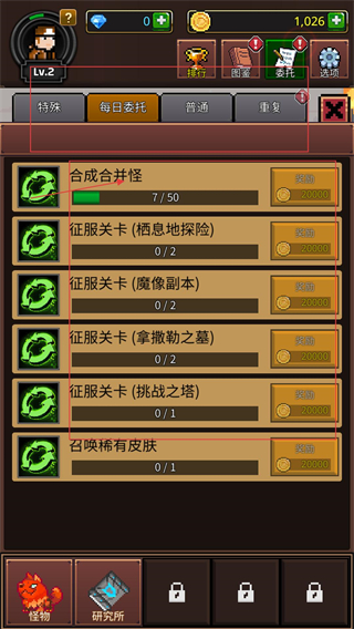4、玩家需要完成每日的委托含多任务,完成合成、征服关卡得金币,优先做高进度任务。