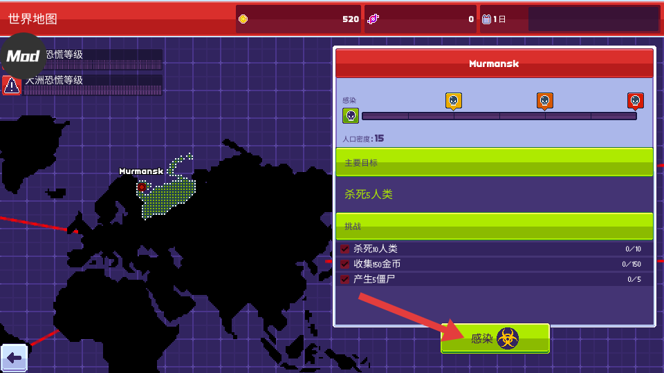 1、点击【感染】,开启Murmansk的感染任务,完成杀死5人类等目标。