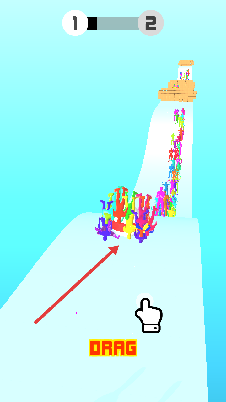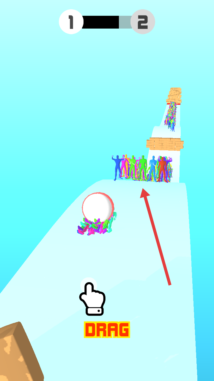 2、拖动粘人球,吸附彩色小人以壮大球体,同时向关卡目标推进,突破砖块障碍。