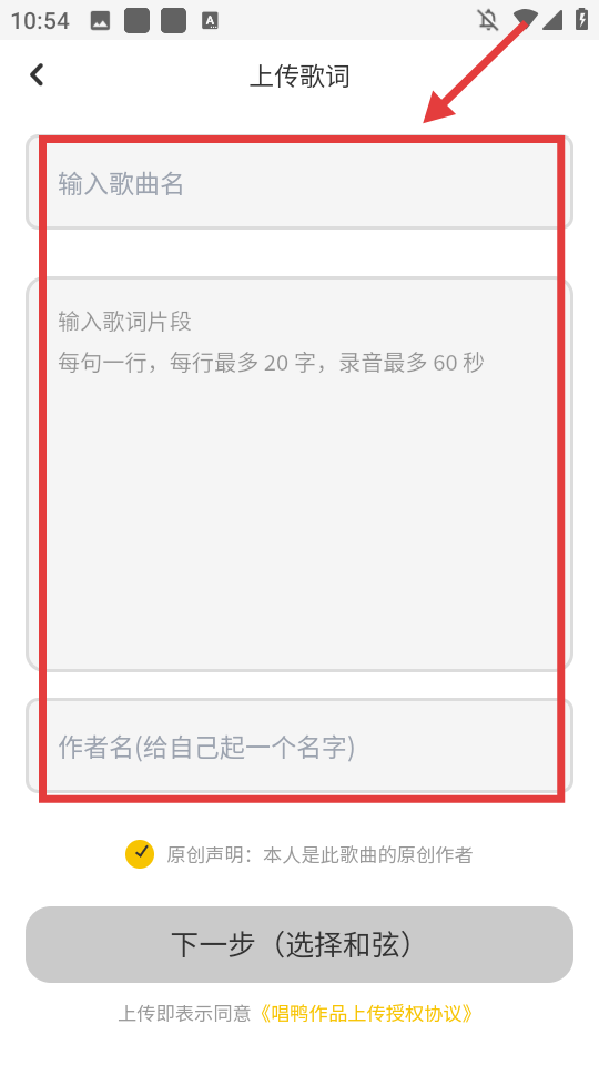 4、填写歌曲名、歌词片段、作者名等信息,完成原创作品发布操作。