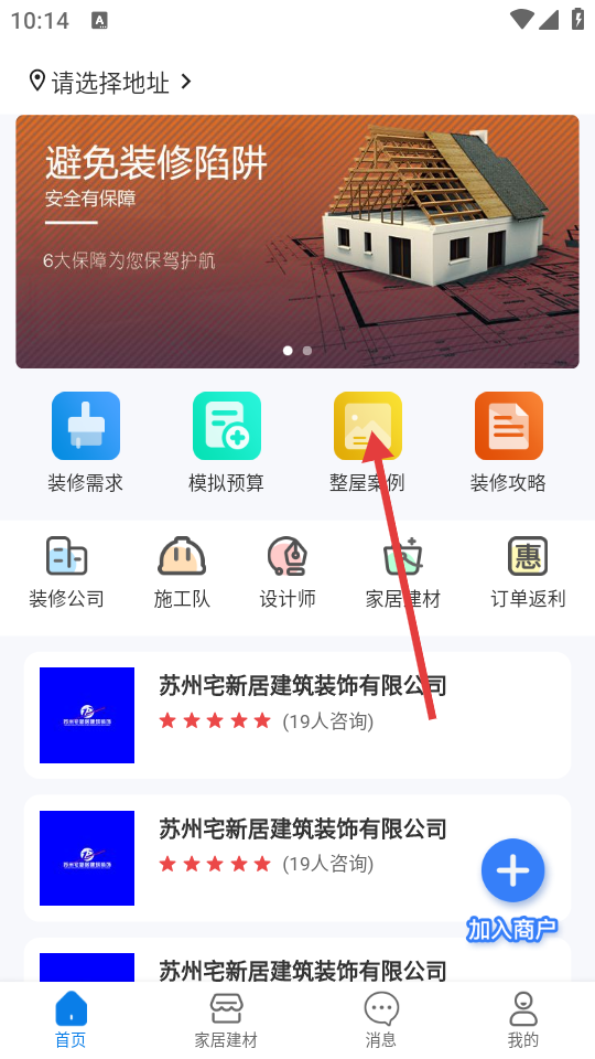 1、打开APP,在首页点击【整屋案例】图标,进入“整屋案例”页面。