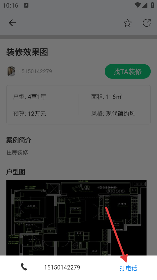 4、在弹出的提示栏中,点击【打电话】按钮,即可拨打该联系电话,与装修方取得联系,沟通装修相关事宜。