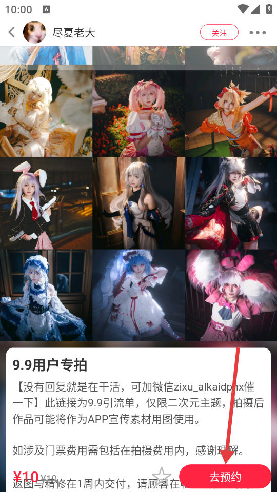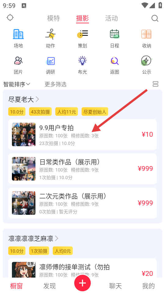 2、在橱窗页面,选择目标拍摄服务(如“9.9用户专拍”),点击进入服务详情页面。