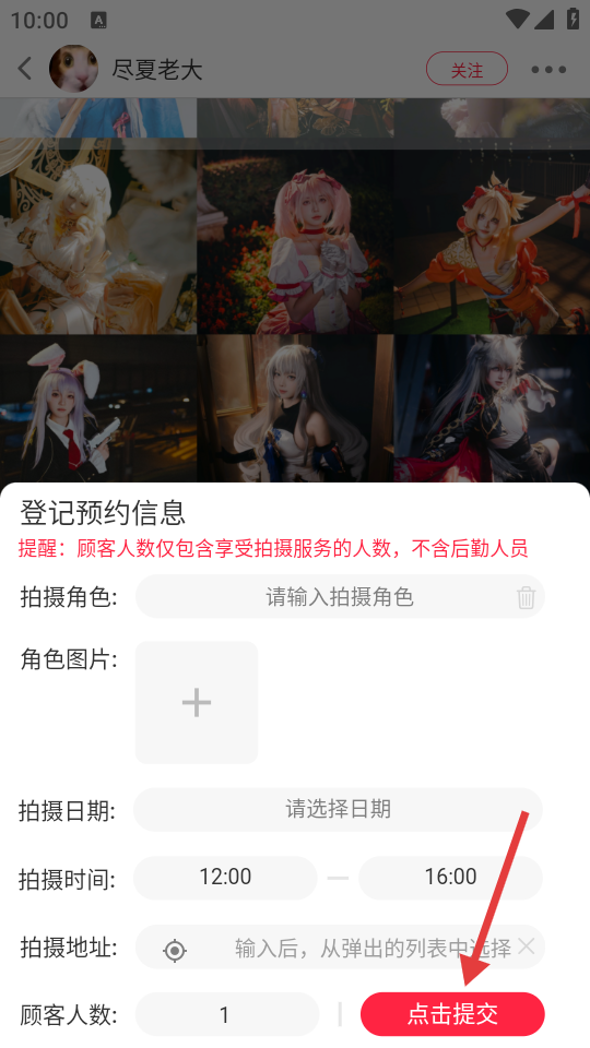 4、在“登记预约信息”页面,填写拍摄角色、拍摄日期等信息后,点击【点击提交】按钮,完成预约操作。